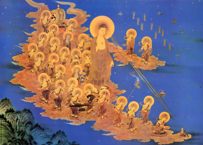 这可以比喻为水和月亮的关系。阿弥陀佛的大愿就像天空的月亮,我们信愿念佛的心就像水,这两者缺一不可。如果只有你念佛,没有阿弥陀佛的大愿,那么你见不到阿弥陀佛来接引;如果只有阿弥陀佛大愿,你不去念佛,同样,也见不到佛来接引。所以这两者是感应到一起才出现的境界。当月亮影现在水里的时候,你能说月亮是从天空下来了吗?实际上它并没有下来。所以你临终见到阿弥陀佛,不是说阿弥陀佛是从十万亿佛刹之遥远的西方极乐世界过来了。这就是感应道交,不可思议的产物。