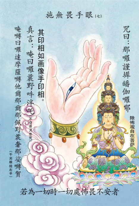 7、若为一切处怖畏不安者,当于施无畏手;(当修施无畏法)