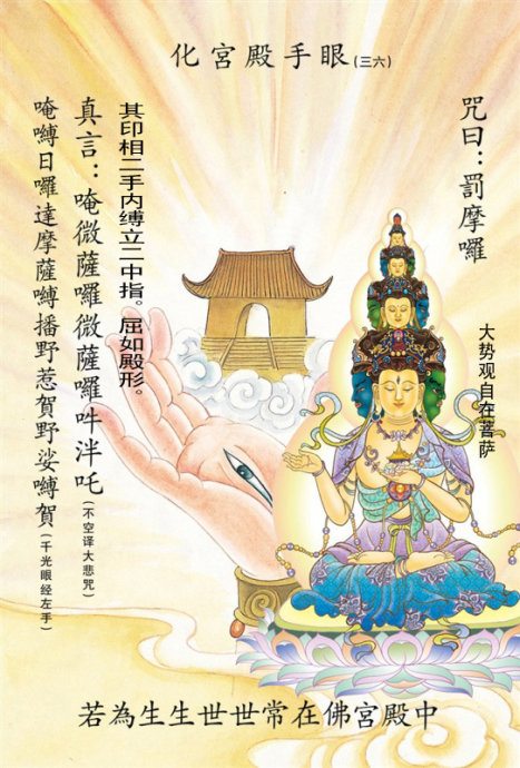 36、若为生生世世常在佛宫殿中,不处胎藏中受身者,当于化宫殿手;(当修宫殿法)