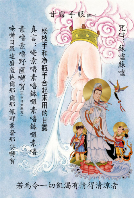 因某一方面修习大悲咒时,先念大悲咒5遍,然后念相应四十手的某一咒语108遍(或经中指定遍数),功德卓著。这是大悲经中所叙说的,而往往没被大悲咒修习者所重视。我向在座各位力推这一修法。例如:若为腹中诸病,当于宝钵手。加持大悲水时,先念大悲咒5遍,然后念宝钵手真言108遍,令患者服用。