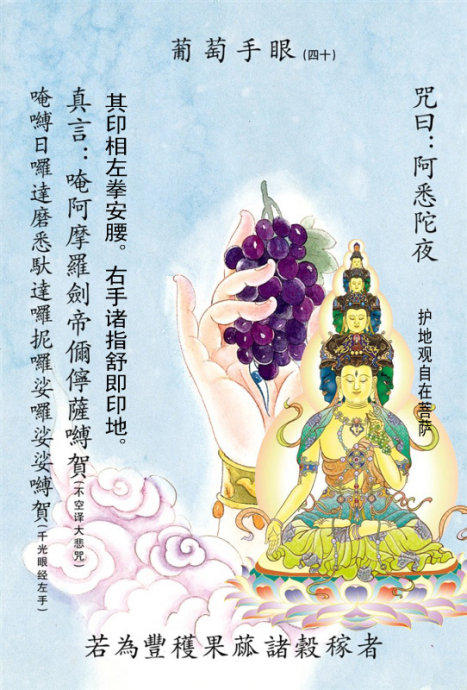 以上四十手,就是四十种印契,分别代表四十种修法。每种修法又分别对应一尊观音法像及相应的真言。这四十尊观音的名号为: