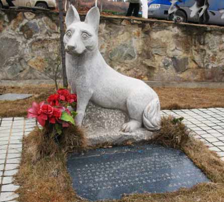 江西九江林业汽修厂全体职工为一条义犬立的雕像,碑文:“赛虎,三岁余,雌性狼狗,育有十三子。2003年11月28日,林业汽修厂晚餐炖一大锅肉,赛虎一反常态,对锅狂吠。众人遂掷肉于地,赛虎不食,依旧哀嚎不已。众人不解,准备进餐。赛虎回望主人,悲鸣数声,吞下地上之肉,随即七窍流血中毒身亡。此刻,人们终于明白,义犬赛虎以死警示肉中有毒,挽救了三十余人性命……今葬贺家山,立碑铭志以警世人!”