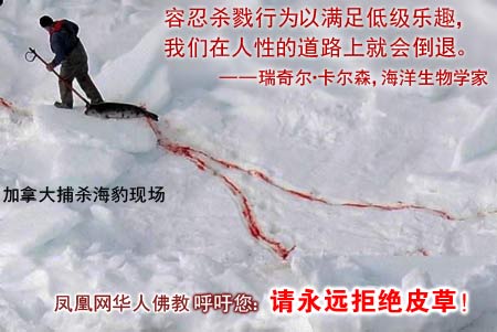 加拿大每年大量捕杀海豹,为的是海豹们美丽的皮毛可以被用来制作价格高昂的皮草服饰,而这些皮草服饰大部分销往亚洲尤其是中国市场,凤凰网华人佛教呼吁您:没有买卖就没有伤害,请永远拒绝皮草!(图片来源:资料图)