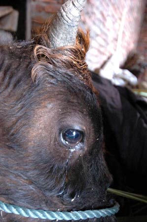 不由得想起了之前看到的有关香港一头待宰水牛流泪的报导。当时,一群工人牵着这头水牛走进厂子内,准备将其宰杀做成牛排和炖牛肉。当他们接近屠宰房门口时,水牛突然停步不前,两只前脚往前跪下,眼泪也跟着扑簌簌地流了下来,眼中充满了恐惧和悲哀。在场的工人们无不被这骇人之举所震撼,有些人也不觉流下了眼泪。最终工人们决定共同出钱将其买下,送到佛寺中让其终老。而水牛也似乎明白了人们的心思,止住了眼泪。