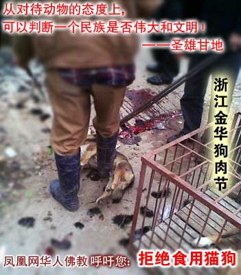 浙江金华延续了六百年的狗肉节,当街屠杀狗狗,2011年在各方人士的呼吁下,狗肉节停止举办,然而食用猫狗的陋习并非停办一个狗肉节既能改变,凤凰网华人佛教呼吁您:它们是忠诚的朋友,如果暂时还做不到素食,请先从拒绝食用猫狗开始!
