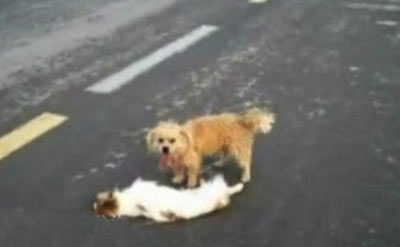 今年4月,泰州晚报还曾报导过一只小狗过马路时,不幸被汽车当场撞死。随后,小狗的两个同伴赶来,围着尸体哀嚎不已,稍大的一只狗还流下了眼泪,让路人唏嘘不已。