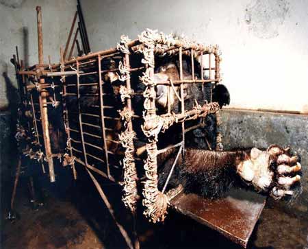 为了获取熊胆汁,人们在野外下陷阱捉到熊后,将其关在牢笼中二十多年,每天透过插入熊胆的铁管抽取胆汁数次,其痛苦难以言表。一头母熊为了避免自己的孩子遭受这样的折磨,含泪将小熊撕碎。