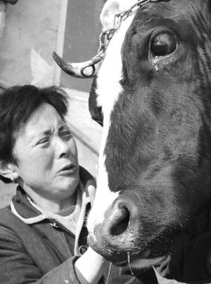 2009年3月7日,沈阳市东陵区深井子镇前康村奶农白凤琴,因家庭变故自己无力再饲养奶牛,在决定将精心饲养的奶牛卖掉时,主人与牛落泪相对(图片来源:资料图)