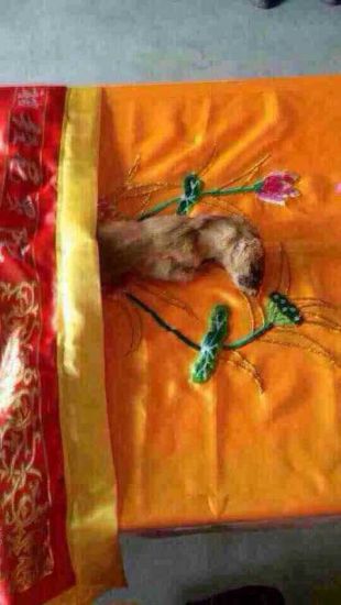 它的觉性感动了师父和在场的道友。师父用简短的五分钟为它授了三皈五戒,作了开示。最后明净师父说:如果你听懂了开示,你就舍了这身皮毛吧。神奇的是,当下它就扑通倒下往生了。