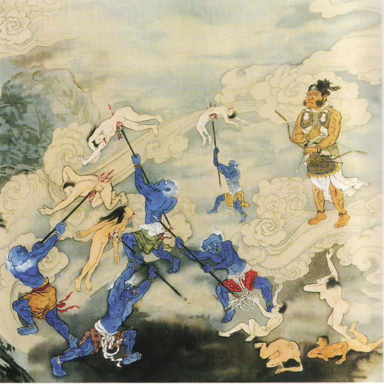 《经律异相》云:凡以恶心毒害众生,以刀叉、铁叉、鱼叉刺害水族类,或捕猎禽兽者,受此戟腹罪报。又此罪报,非仅戟腹而已,乃是遍身刺至血肉模糊为止,苦惨万分,风吹复活,反复受罪,痛苦宣难。