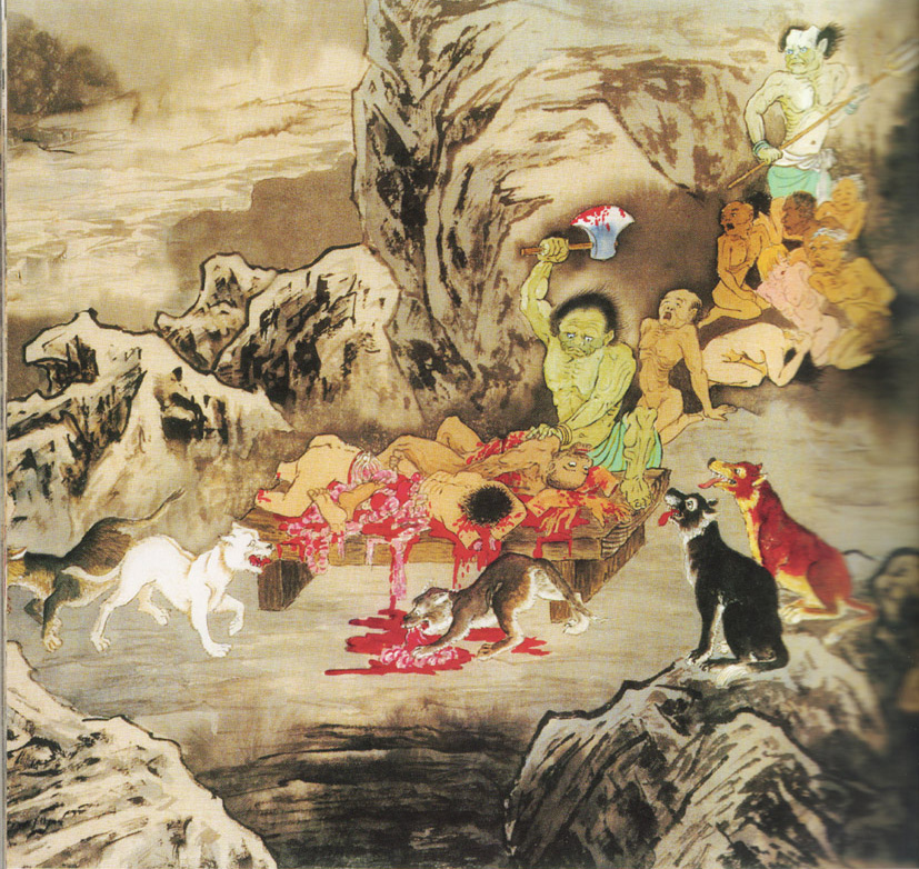 人为饱贪口腹之欲,爱食血肉之躯或杀或剁,或活活斩截,剁成碎块,造作此种杀业,死后同受斫截果报,真是所谓「心业画师,自业画作」,业果分明,自己承受。