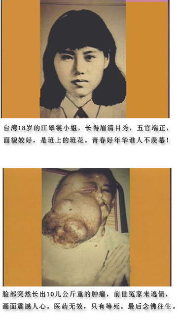 江翠裳小姐长得眉清目秀,五官端正,面貌姣美,是出名的美女。爱美是人的天性,女孩子谁没有花样的年华,青春的岁月。可是,我们无始劫的业力,不晓得什么时候会成熟,业力现前的时候,就会让美丽的面孔变成这样一张恐怖的面孔——她的右脸上生出十数公斤的肿瘤!它从一颗癌细胞,一直从脸上蔓延到胸口。漂亮的女孩子,脸上长这么大个瘤子,连自己都不敢看了。这才知道什么叫做业力,什么叫做病苦。 有位师兄一看到这个照片,都吓得哭了,当场发誓:“我再也不敢做坏事情了!”怕报应来时,让你求生不得,求死不能。