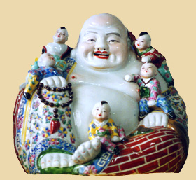 五個小孩代表五欲, 財、色、名、食、睡。彌勒菩薩在五欲六塵裡面有肚量能包容,五欲六塵裡面行大慈悲。