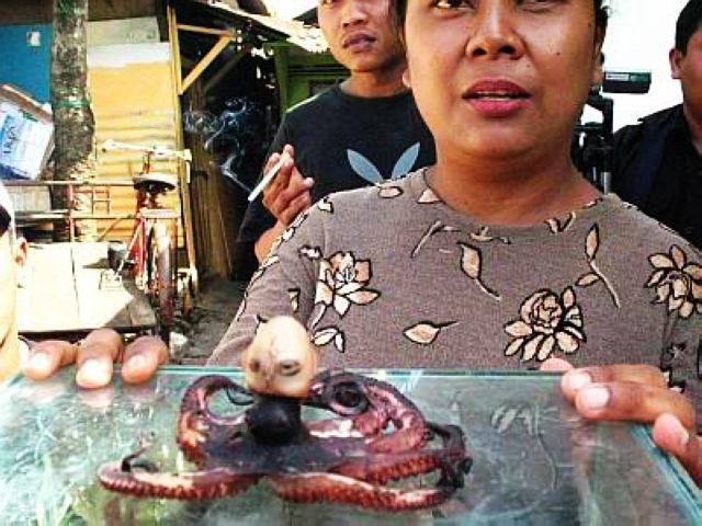 如果你正在烹煮食物,但锅中却出现异象,你一定会惊讶不已!印度尼西亚妇女妮塔日前在煮章鱼时,随着温度上升,锅中竟出现鸣鸣哭声,她打开锅盖一看,赫然看到一只有着人头和突出胸部的章鱼在求救。