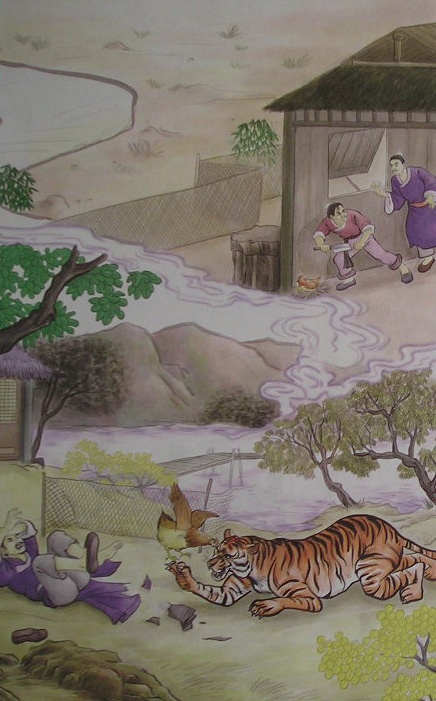 后来,里胥再来时,见母鸡率一群小鸡,向前踊跃欢舞,好象表示感恩的情状。里胥办妥事情回去时,行走百步,途遇老虎出来,正在惊慌恐惧时,忽见母鸡飞来猛扑虎眼,里胥因而逃脱,免遭虎难。