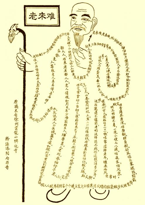 过去有人用这首《老来难》写出了一个身穿长衫拄杖老人的画像,长衫全部是由密密麻麻的文字、语句所组成,老人慈祥端正、惟妙惟肖,形象逼真。在农村很多人将它贴在屋里,用来提醒人们的孝敬心,久传不衰。