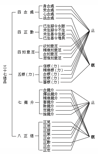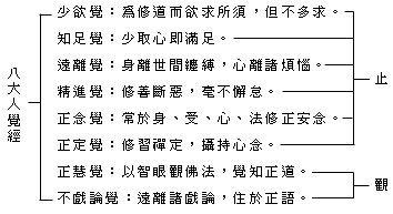 1.数:计算入息或出息的次数,以收摄心於一境中,使身心都能止息。数息的方法是从一到十,反復地数,不增不减,因为如果少於十,则易引起急促;如果多於十,又恐怕引起散乱。同时,还要远离三种过失: