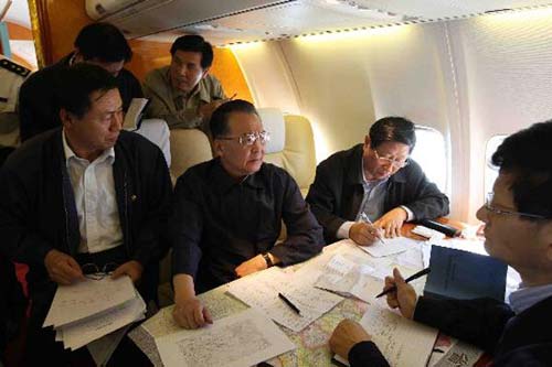 **在专机上研究布置抗震救灾工作。 (图2)