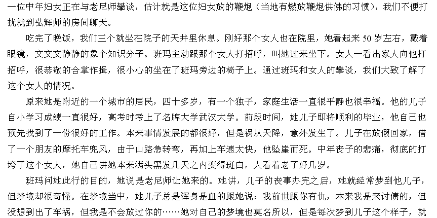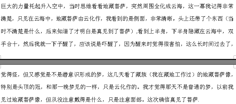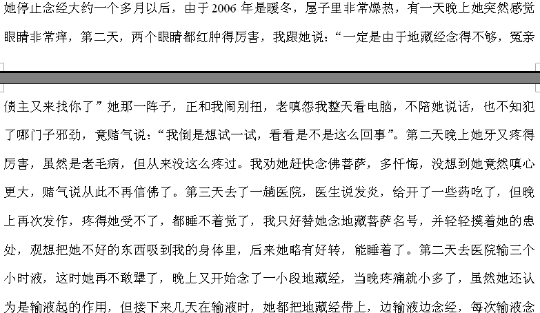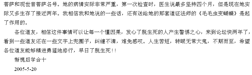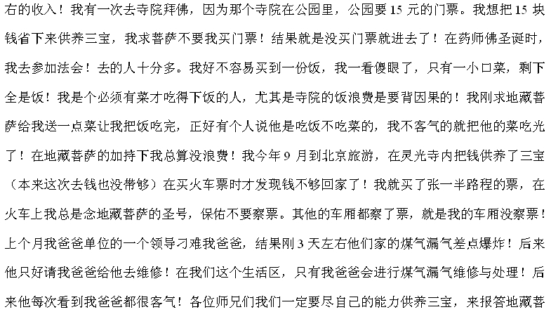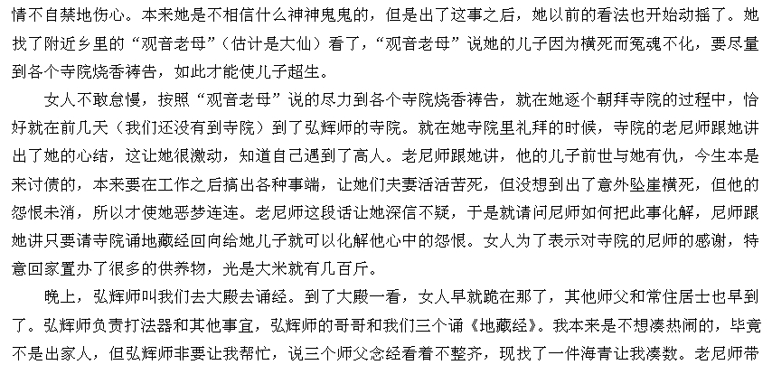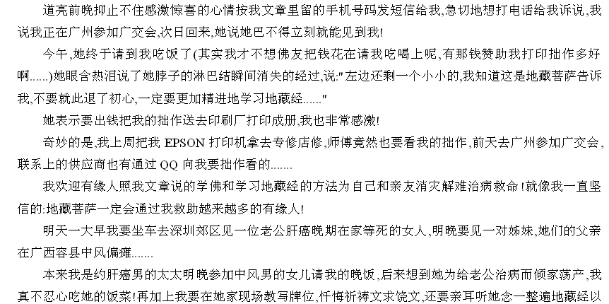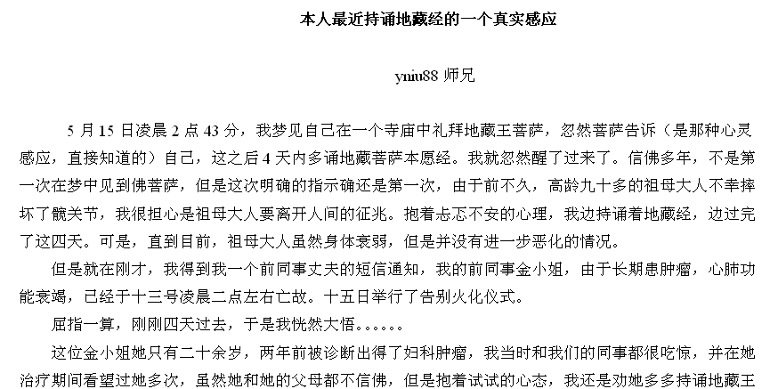 还有一件事就是我一个朋友和我说了一个梦,说梦中一个古代装束的人用马车隆重地把她请到了一个地方,见另一个人,但她心里清楚见的那人是一个鬼. 我告诉她不必害怕,瞎猜说可能是你的前生的亲人有求于你,我又信口开河地说我念地藏经时可以回向给她(鬼). 当天晚上是周末,我十二点才睡,两点多又醒来,看书看到三点多才打算再睡,闭上眼感觉屋外老有人走动,怕有小偷留意着不敢睡. 后来闭眼要睡感到房间里好象什么东西晃来晃去,害我睡不着,忽然想起白天我答应朋友的话,遭了,不知是不是真有急事催我起来念经?我看表:六点多,起来就起来吧!洗漱完毕,看表,五点多,不会吧?担心事情不好了怕被我耽误了心更急,因为天快亮了,连忙赶紧念地藏经. 这恐怕是有史以来最精进的一遭了. 过后还心有余悸:答应过人的事不完成已是妄语,更何况鬼神!