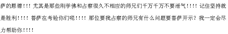 我星期一去人才市场面试麦德龙,当时看见人多心里没有底。于是在面试开始前就默念南无地藏王菩萨,一直到面试结束。我当时感觉很顺利,到下午麦德龙人事部就打电话通知我两天后去复试。我在下午念了三千五百遍地藏圣号后,开始就以下问题占察:“我想麦德龙深圳店尽快通知我去上班,并录取我为员工”,得83,即“所疑即为事实”。