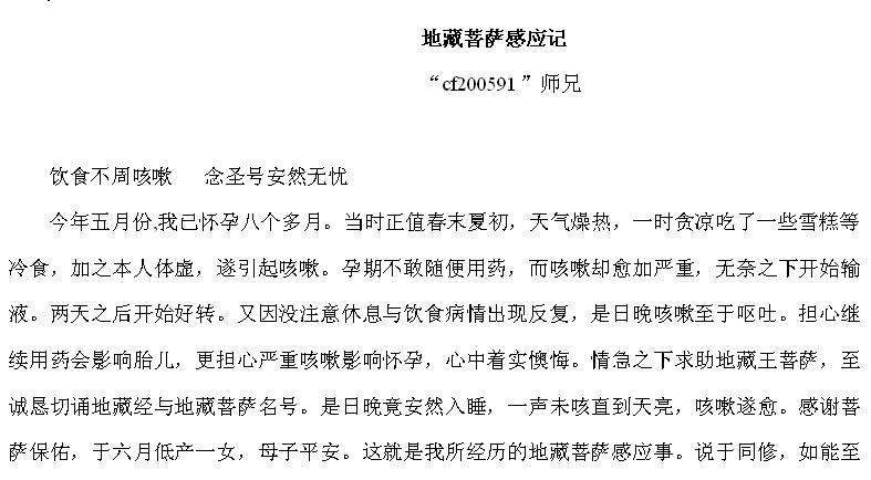 2002年底,我母亲从佛友处请来一本《地藏经》,我就被里面的内容所吸引,其中最吸引我的就是关于“新产者”:“或男或女,七日之中,早与读诵此不可思议经典,更为念菩萨名可满万遍,是新生子,和男或女,宿有殃报,便得解脱,安乐易养,寿命增长;若是承福生者,转增安乐及与寿命。”的字句。当时我妻子已经怀孕,我母亲也已经在观世音菩萨面前求男,我就试着按照要求念《地藏经》。