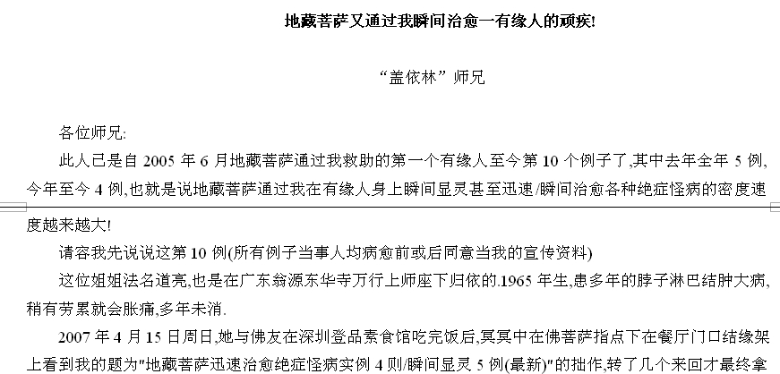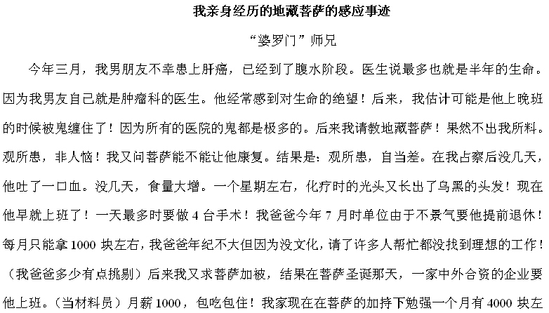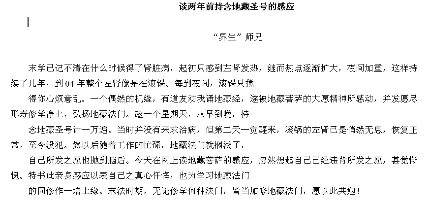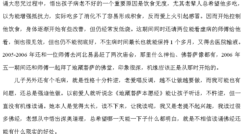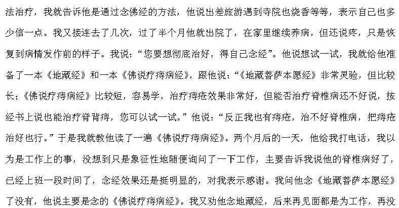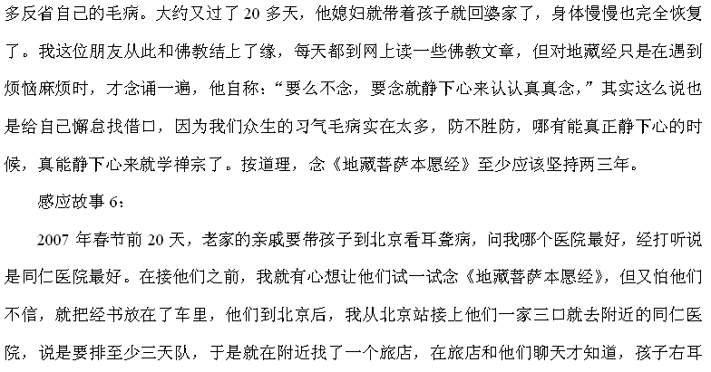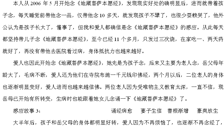2003年初,初次在佛教在线的在线晚课诵地藏菩萨本愿经。因为经文不熟悉,读诵时也就来不及思考经文的意思。在读诵了10来天后,有一天忽然发现,自己20来年的慢性菌痢、肠炎没了。以前天天腹泻,大便不成形,吃药效果也不明显。另外,以前只要喝冷水、温水或吃水果就会引发肛周静脉发炎、直肠肿胀,继而化脓,不敢弯腰不敢走动,穿衣脱衣都要老婆孩子帮忙,非常痛苦。诵地藏经后,那些病都霍然不药而愈,不翼而飞!而且只用了十来天时间,只诵了大约两部。