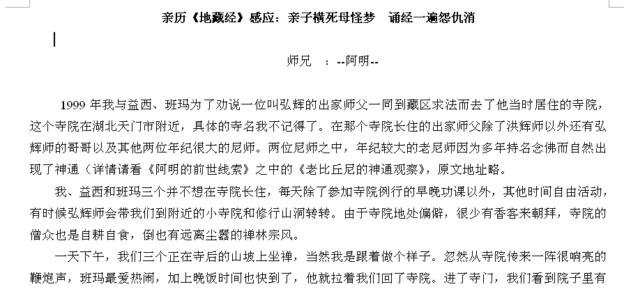 晚上,我也不管其他什么事,我要诵经,那一夜,我诵了好多时间,在地藏经,大悲咒,还有其他,直到半夜,竟越诵越精神,第三天父亲穿衣时,身体竟很软,与母亲去世时礓硬的身子不同。而后的日子,我就天天诵经,放生,也不去找工作,就知道念佛。初时,也梦到过父亲,但都是一些极不利的,梦父亲躺在地上,我大哭着给父亲输真气(一种以前练气功的习气),梦父亲向我要酒喝,我大哭着不让喝,说是酒害了您,许多许多,都不好,在这个期间,我经常去跑寺院,用好几千钱做超度,几千钱放焰口,好几千印经,等等,一次,我偶尔经过多宝讲寺,进去看看,便是我遇上师父的日子,很快,我带着为救度父母的心,去三门的多宝讲寺皈依了,并持戒,也开始系统的学习积二资粮与忏悔的法,而地藏经,却一直未断,那时,梦开始有好转,开始,梦我与许多出家人围着母亲念佛号,母亲是躺在一床上的,有人上前想帮母坐起来,但不行,我也试着帮母亲坐,也不行,念着念着,天边的云忽裂开了,几道亮光直射过来,母亲忽自己盘腿坐了起来。
