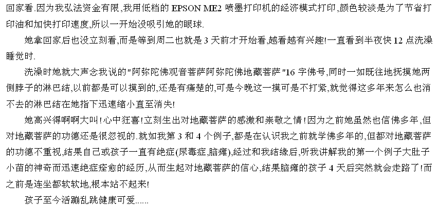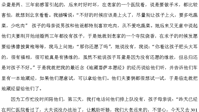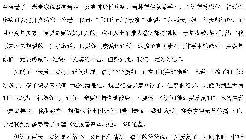 后来, 我妻子说她的同事刚刚生了孩子,我就开始严格按照《地藏经》的要求念,殊胜的事情发生了:在我念经的过程中, 我“看到”了那个女孩子“未来”的样子:她的长相正好是她父母(我曾经见过他们)优点的集合!