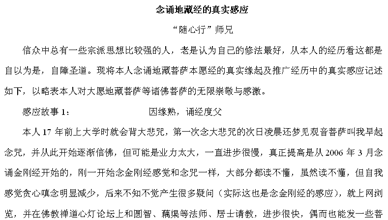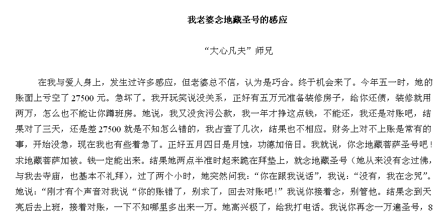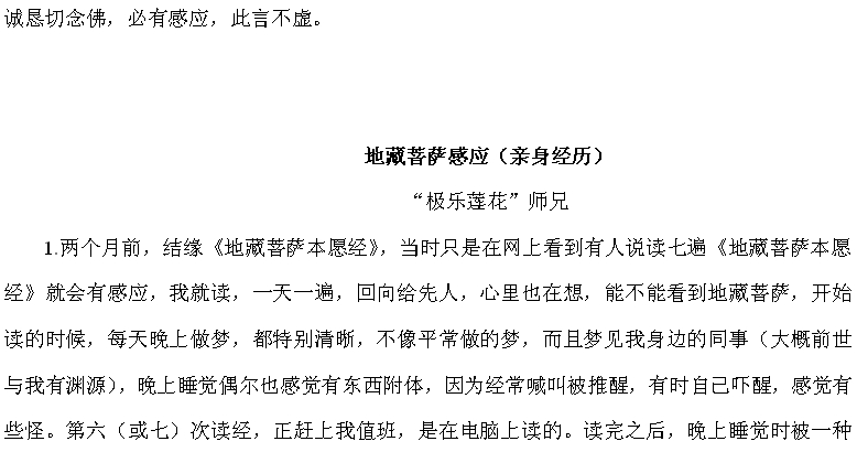 我工作近十年,虽然业务能力强,得到大家的公认,但由于不会阿谀奉承等诸多原因(主要是自己福薄),一直没有得到提升。可当我刚刚发愿为亲人健康念颂了7遍地藏经后不久,居然意外地得到了提升,本来我已经对此没有任何所求了,真是无求自得呀!