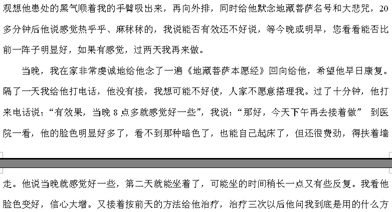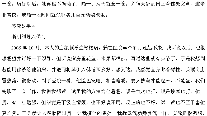 一整夜我们念经和圣号.我同时发了一个小愿,一天不吃饭,诵经念菩萨.第二天上午奇迹发生了,母亲的脸色开始好转,变得润白了,比活着的时候还好看,10点多钟有个卖寿衣的到门口,正好有母亲丢失那样的寿衣,就买了一件.穿衣时发现身体也变得柔软了.
