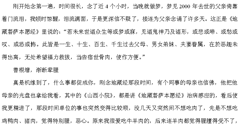 我父亲于去年年底去世,在去世过了两七即14天后,我在寺院请寺里的师父为我父亲做完超度的佛事后,我问一位师父,我该再为我父亲做些什么,师父让我颂地藏经,我当即在寺院请了一本《地藏菩萨本愿经》,由于上面是繁体字,于是又请一本佛教经典常用字字典,第一次颂地藏经,花了两个小时四十分钟,在后来就比较好了,从我父亲去世后第十五天到第四十九天(三十五天内),我共颂了145遍地藏经,加上和我嫂子颂的五遍,共是150遍,在今年的正月三十,这已是我父亲去世后近八十天了,也是我皈依后的第三天,我中午午休时,做了一个奇怪的梦,梦见我死了,因为我死了,我就哭得很伤心,梦见我到了一个地方,有一张桌子,桌子两边各有一个人,桌子那边坐着一个人——好像是个长官,旁边还有七八个我好像认识的人,也有一些不认识的人,那个坐在桌子那边的那个长官模样的人就对旁边的人说:“这个人的父亲去世后,这个人为他的父亲颂了地藏经了,让这个人还生到人道里去吧”这个人的话说完,我就醒了,醒来时我的眼睛里还流着眼泪,因为在梦中哭和缘故,我的头还有点疼,昏昏沉沉的,至到晚上我念完佛才不疼了。回想起了真是不可思议。