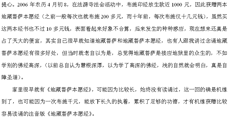 也就是这样的善缘,我开始了在“十斋日”念《地藏经》!(惭愧的是,后来,以种种借口,停念!非常可惜!),并出资印《地藏经》。也开始了以实际行动来学习地藏菩萨,来自度和救度众生。