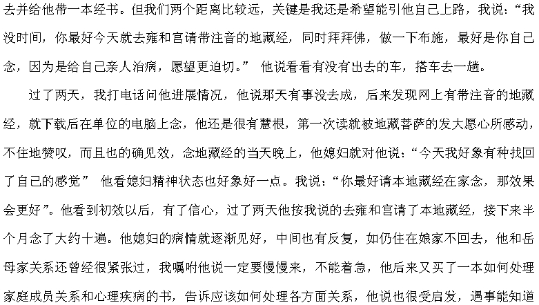 这些年,家里的亲人被怨亲债主所困扰,已经六年病休在家,而且两次徘徊在死亡线上,怪病缠身,而且有很多怪癖,因此弄得父母非常痛苦,家里气氛压抑,经常争吵。自从我母亲和我开始念颂地藏经以来,病人的身体虽然没有完全康复,但有了很大的改观,父亲的脾气也大有好转,现在很少吵架了。