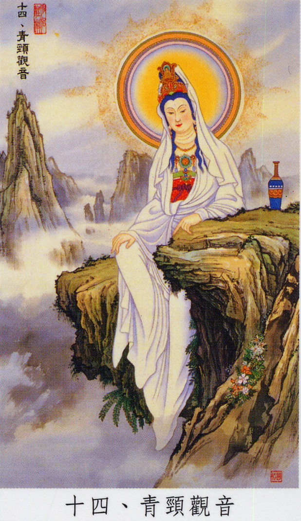 十四、青颈观音(婆罗门身):青颈观音,其像为三面四臂,所持之物为杖、莲花轮、螺四种,身色为红白,颈为青色。传为观音降魔解救众生,为不使毒药传世害人而吞食,致使颈呈现青色。或释为表卅三身中佛身