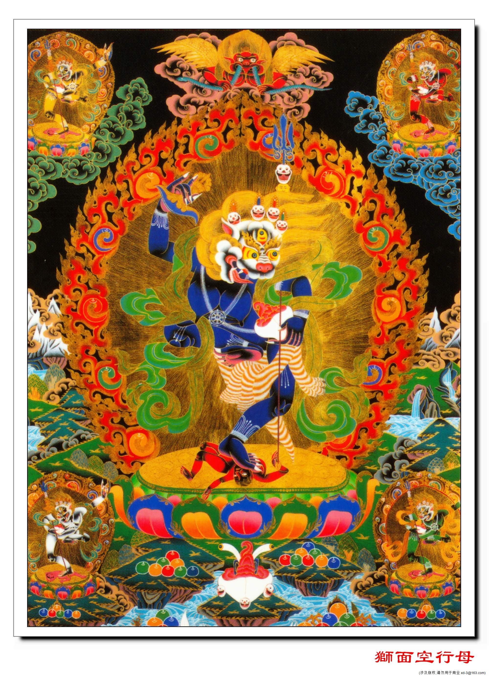 解说:狮面空行母原始法身为般若佛母,报身为金刚亥母,而化身为狮面空行母,为宁玛派的殊胜本尊,也是莲花生大士的护法,可遮止一切邪魔,具大威神力。