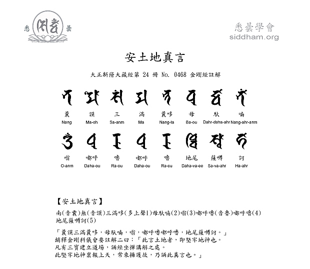 曩莫三曼多母驮南(一)唵(二)钵罗(二合)婆(三)啰怛你(四)设哩三曼多(五)阿驮阿驮(六)阿豆阿豆(七)比里底毗比里底毗曳(八)莎诃