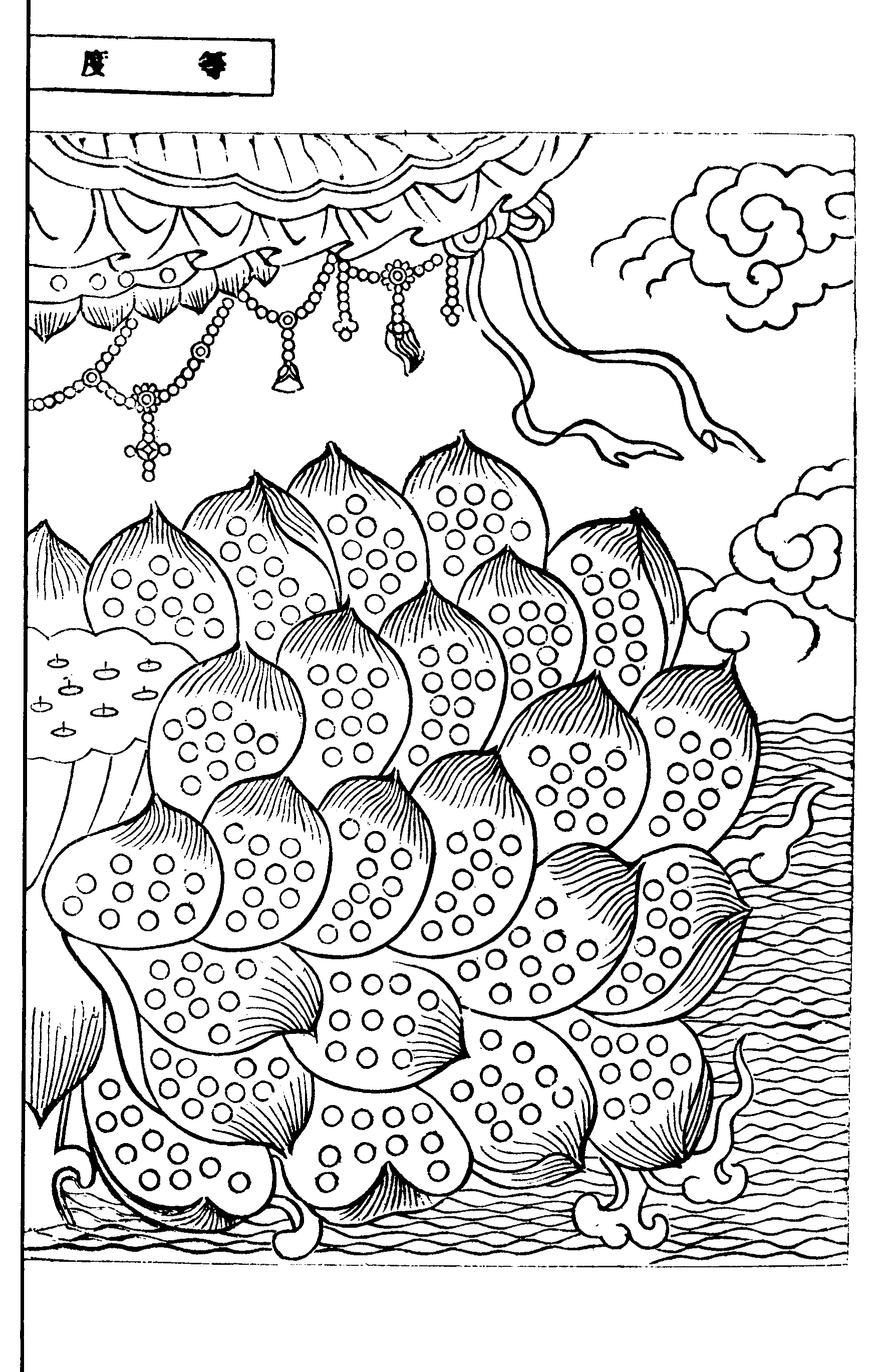 右九品莲台及大圆镜图。共四千八百圈。每诵佛名十串。以朱点一圈。合各串零头。约得五百万之数。积久点满。又以黑白青黄四色点之。分点五次。计得二千五百万。填满后再易新本。若能勤行精进。每点各加十倍。以万当千。更好。其旧本或向佛前焚化。或俟临命终时焚化。仗此胜因。决生净土。每本填满。即注云。