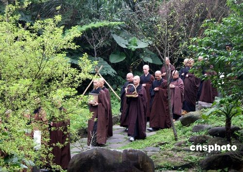2月15日,台湾法鼓山创办人圣严法师追思法会暨植存在法鼓山举行。图为参加追思法会后,法鼓山众僧与信众及马英九、萧万长等送圣严法师舍利函前往植存区植存。 中新社发 陈立宇 摄