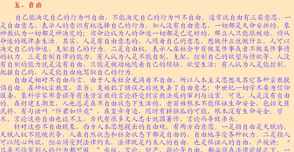 平等是指人的权力在性质和数量上相同,它包含人在自然状态下和社会中权力的两个方面。社会上存在着许多不平等,千万不平等的因素,有宗教神权上的不平等和社会方面的不平等。印度婆罗门教认为人天生存在四种姓差别,四种姓指婆罗门种姓、刹帝利种姓、吠舍种姓、旃陀罗种姓。人是由大梵天创造的,大梵天的嘴巴、肩膀、肚脐、脚底分别创造不同种姓人。人天生就不一样,前三种人可以再生,旃陀罗种姓是贱民,不可以再生。在印度,婆罗门至高无上;刹帝利掌握政权,管理国家;吠舍是从事工商业、资产阶级;旃陀罗则是不可见的人,不允许碰到别人身上,万一碰到了别人,别人可以将其打死,生存的基本权利都没有。ji 督教认为,人是由神决定的,人生下来就有富贵、贫贱之分,生命的起点、天资不一样,人天生就不平等。人死后要遭到上帝的审判,上帝根据你的行为判定升天堂或下地狱。而每个人天生不一样,有些人生存善良家庭里,受到良好的教育,不需要做坏事;有些人从小在盗犯之家,那就该抢劫、偷盗,由此决定着人死后的命运,显然也是不平等的。另外,在社会方面也是不平等的,奴隶与奴隶主、君主与臣民之间肯定是不平等。在封建ZHUAN制国家,皇帝至高无上,官僚等级层次明显,不同层次官僚权力是不一样的,官僚与百姓的权力差别很大。中国古代社会是根据伦理纲常,现代社会还有血统论、民族优越论、职业优越感,总是充满着不平等。以卢梭为代表的西方人本主义认为,人天生就该平等、自由,人在法律保障基础上的社会权力也是平等的,人在自然状态下是平等的,有了私有制后,产生了特权阶级,使社会产生不平等现象,人类社会要通过一种契约方式,建立一种更高级的平等。佛教也讲平等,可以从以下六个方面来说明:
