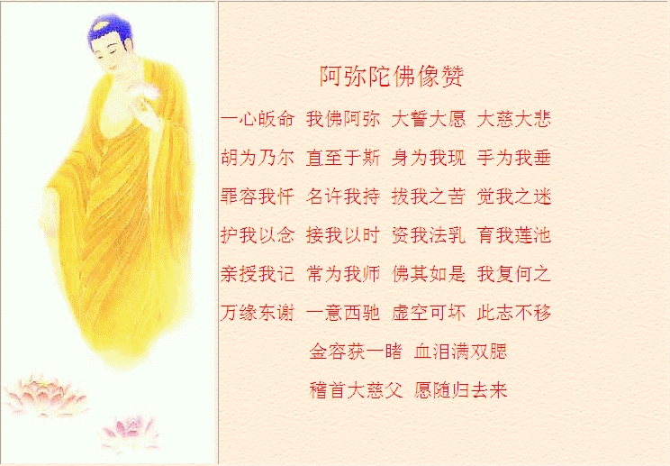当时法藏比丘说完此四十八大愿之后,大地普六种震动,天空落下殊胜妙华,空中传出音声赞叹:"决定必成无上正觉。"