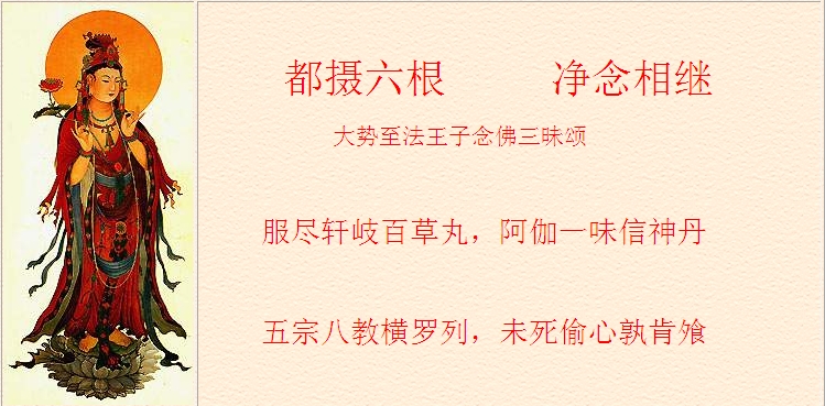 《首楞严经》所陈述的念佛法门,尤其恳切重要:大势至菩萨禀白佛言:“在我记忆中,于过去恒河沙数时劫以前,有佛出世名‘无量光’。十二位如来,于一劫之中相继成佛,最后一位佛陀名为‘超日月光’,彼佛教我念佛三昧。譬如有两个人,一人专心忆念对方,而另一人则专门遗忘对方,如此两个人,有时相遇有时不相遇,或者相见或不相见。如果如是两个人都彼此互相忆念,两个人互相忆念的心思很深,那么如此乃至于生生世世,就如同形影相连,不相违背远离。十方三世诸佛如来,慈悲怜悯思念众生,就好像慈母忆念最亲爱的独子一样。如果孩子要远离逃走,那么慈母虽然思念孩子又有什么用。孩子若是也能想念慈母,就如同母亲思念孩子一样时,母亲与孩子虽然经历多生,也不会互相违背远离。若众生的心中,忆想佛陀思念佛陀,或者现生或者将来,必定能够亲见佛陀,离佛不远。不必假藉其他的方便法门,只要专心忆佛念佛,自然可以真心开显彻见本性。就如同染香的人,身上自然有香气,这个则叫做‘香光庄严’(以佛的法身香、智慧光,庄严自心本觉佛性)我本在初心修行的因地,以念佛之心,入于无生法忍。今日在此娑婆世界,摄受念佛修行的人,导归于西方极乐净土。佛陀问我证得圆通的法门,我没有别的分别选择,只是一起收摄六根,净念不断一心念佛,而达到三摩地定慧等持的境地,此念佛法门实在是最殊胜方便、最为第一。”大势至菩萨,以念佛法门入于佛道,乃至修菩萨行,度化众生,都不离开这个念佛法门。修行净土法门的人,应当知道要学习效法啊!