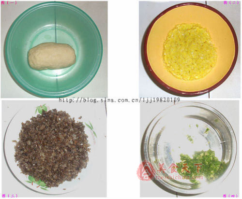 3、准备做馅的材料。把洗干净的嫩白菜叶剁碎后放在菜盆里,在上面撒上适量的盐搅拌后腌制5分钟,然后挤去水分备用;把水泡木耳切丝后剁碎备用;把葱、姜切碎备用。效果如图;