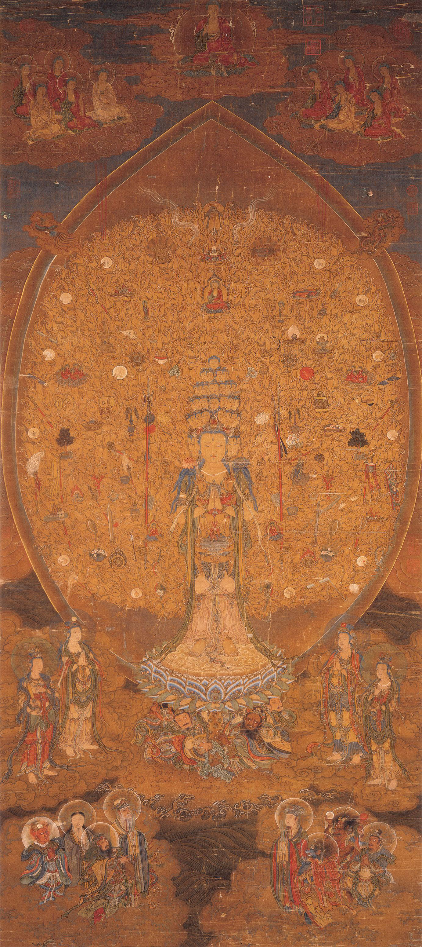 万顷波涛,四天王背负著一座七宝莲台,千手千眼观世音菩萨十分庄严地站在台上。左右各有两位菩萨随侍,下方的天龙八部双手合什,向观音菩萨示敬。观音菩萨头戴化佛宝冠,绀发垂肩,双唇上下都有胡髭,仍作男相。但五官秀美,已流露出女性化的特质全图赋色妍丽,璎珞装饰和七宝莲台都描绘得十分仔细。人物衣纹线条柔劲流畅,这些特色都与传至日本的南宋佛画十分类似,是一幅难得的南宋佛教绘画精品。