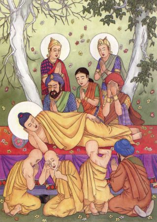 世尊于入灭前三月,曾提示阿难三次:「得四神足者,能住寿一劫」,但阿难皆未请佛住世;尔时魔波旬,即来佛所,劝请世尊入于涅槃。世尊心知化缘已尽,便于拘尸那城娑罗双树间,将入涅槃,是时中夜,语诸弟子:「汝等比丘,勿怀悲恼!若我住世一劫,会亦当灭;会而不离,终不可得。自利利人,法皆具足,若我久住,更无所益。应可度者,若天上人间,皆悉已度;其未度者,皆亦已作得度因缘。自今以后,我诸弟子,展转行之,则是如来法身常在而不灭也。是故当知,世皆无常,会必有离,勿怀忧恼,世相如是。当勤精进,早求解脱,以智慧明,灭诸痴闇。世实危脆,无坚牢者。我今得灭,如除恶病,此是应舍罪恶之物,假名为身,没在老病生死大海,何有智者,得除灭之,如杀怨贼,而不欢喜!汝等比丘,常当一心,勤求出道。一切世间,动不动法,皆是败坏不安之相。汝等且止,勿得复语,时将欲过,我欲灭度,是我最后之所教诲!」世尊如是慈悲咐嘱,而后寂然入灭。