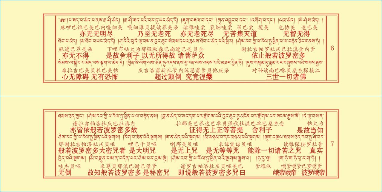 《般若心经》特别能驱除我们各种的障碍。在西藏各派中,有各种不同的修诵仪轨,以念诵经文及参思其内义配合一些观想的方法,可以很有效地除障息灾。大家若果要发心念诵《般若心经》的话,可以在早上念诵九遍,若诵少一些或多几遍也是可以的。但作为除障的话,我们一般都是诵九遍的。在念诵经文后可以再另外加诵明咒(即经中最后咒语之: 揭谛!揭谛!波罗揭谛!波罗僧揭谛!菩提萨婆诃!)若干遍,然后念诵除障偈: