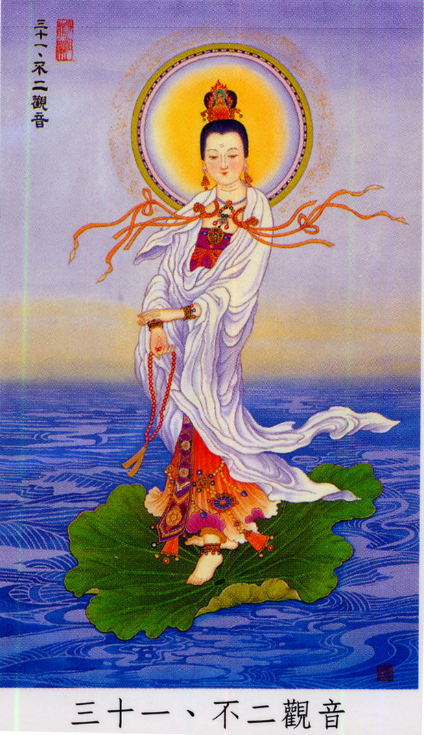 三十一、不二观音(紧那罗身):双手相*或低垂,在水中立或坐于莲叶之上,身着天衣,飘然自得地浮于水面。表执金刚身。