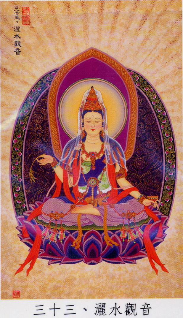 三十三、沥水观音(执金刚神身):又称"滴水观音",一手持瓶作泻水状,一手作法印,或持杨枝。表《普门品》中"若为大水所漂,称其名号,即得浅处"