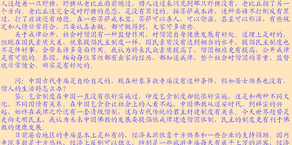 我们今天的人,一说到戒律清规,总觉得是过时的,这是和我们对戒律的无知相关连的。佛教的戒律,在中国尤其是唐代禅宗兴起之后,没有非常认真地实行过,丛林里清规取代了戒律。戒律是民主的、法制的一种制度;清规比较偏向于人制。根据戒律所建立起来的佛教僧团是没有行政机构的,是一个无政府的僧团;根据清规所建立的僧团,是一个非常完整的行政机构。可以这么讲,中国佛教的清规制度多多少少受到中国古代封建君主制度的影响。根据清规所建立的丛林,就是十方丛林,中国佛教除了十方丛林之外,还有子孙寺庙。十方丛林还是一种民主的选择,而子孙寺庙跟封建君主制度更接近些,是师父传给徒弟,徒弟再传给徒弟,这样代代相传的。十方丛林基本上是属于公有制,子孙寺庙则比较偏向私有制。目前海外的许多道场都是子孙寺庙,如佛光山、法鼓山等就比较典型。不同的管理体制对佛教僧团的健康发展有很大的影响,对僧人的修行解脱有非常密切的关系。我们知道,释迦佛制戒是为了僧人修行解脱服务的。私有制寺庙的优点是对事业的发展很有好处,一个人在道场里,可以连续几十年当住持,在寺院里有一贯性,手下弟子可以帮助他完成事业,但对个人的修行解脱却多多少少会带来一些障碍,因为他要长期从事事务管理,就没有时间退下来修行,从解脱上看是有一定的弊病。