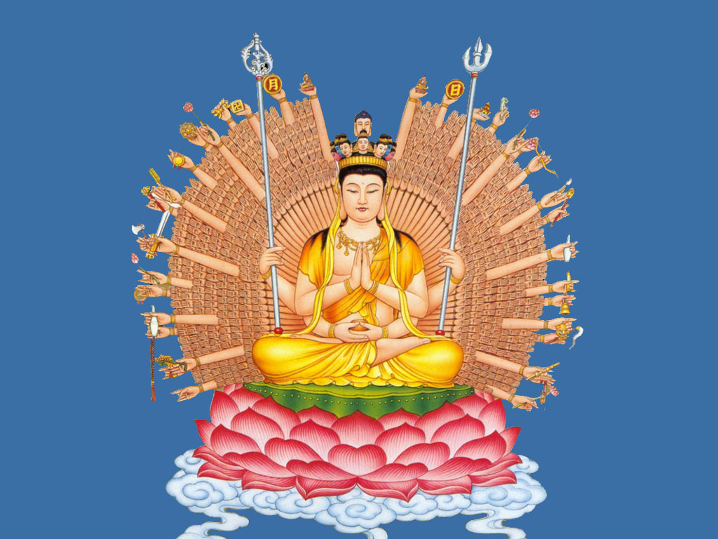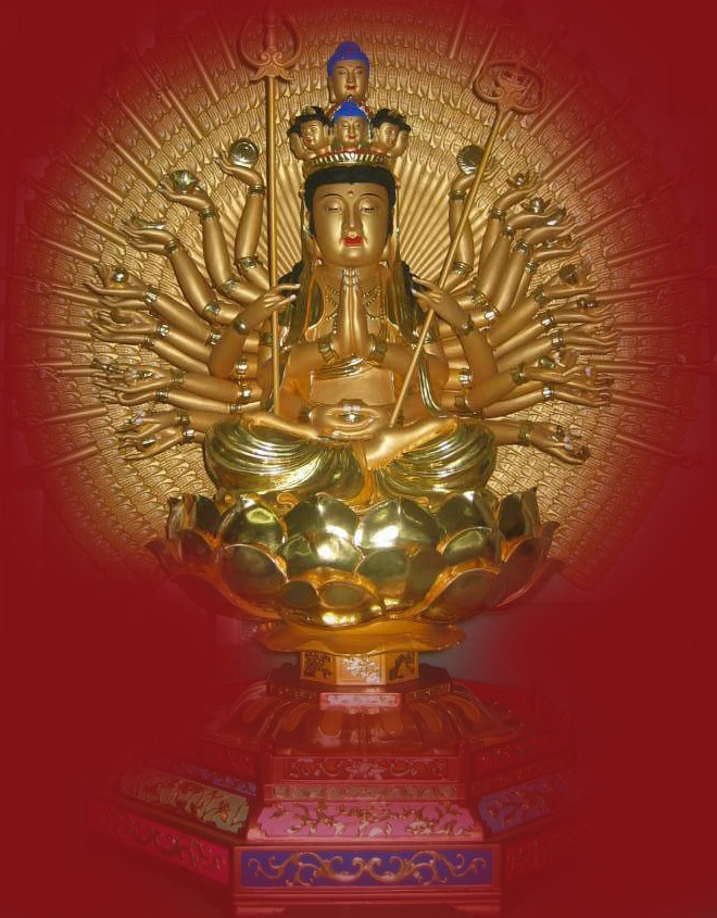 4千手千眼观世音,具足神通广大力,慈眼平等视众生,十方诸国皆显身,大慈大悲观世音,愿平众生业障深,手洒甘露降法雨,灭尽众生烦恼业。大慈啊,大悲啊,观世音菩萨