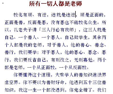 对佛的敬意生起来之后,再往深契入,必定发扬光大,光大到敬爱一切众生,为什么?一切众生都是我的老师。善人,我跟他学善行,他有很好的思想、有很好的见解,他有善言善行,我要学他;不善的人,他的思想不善、见解不善、言语不善、行为不善,那也是我的老师。我看了之后,想想我有没有。一个从正面,一个从反面,都是大恩大德在教我。为我做示现,让我看到、听到、接触到有所觉悟,这就是这经上讲的「一文一法非菩提因」,就是这个道理。